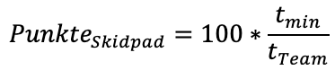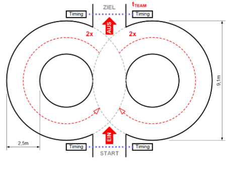 Es wird in das Skidpad eingefahren, der linke Kreis zwei Mal, direkt im Anschluss der rechte Kreis zwei Mal durchfahren und abschließend aus dem Skidpad in die gleiche Richtung wie die Einfahrtrichtung ausgefahren. Die Gesamtzeit der beiden Kreisfahrten wird bewertet.